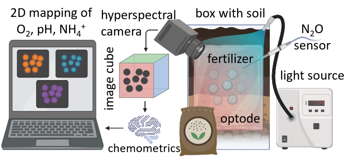 Chemical imaging is a powerful tool for studying complex systems such as soils. Soils release N2O, which contributes to global warming. Chemical microenvironments within the soil, notable O2, NH4+, and H+ levels affect the amount of N2O emissions. However, our understanding of how these factors interact is still lacking. It is crucial to have a tool that can map these parameters in 2D with high spatial and temporal resolutions to develop strategies for reducing N2O emissions. To achieve this, I have proposed a project that integrates optical sensors (optodes), hyperspectral imaging, and machine learning (chemometrics). This project will focus on developing a methodology for the simultaneous and direct imaging of O2, NH4+, and H+ levels.