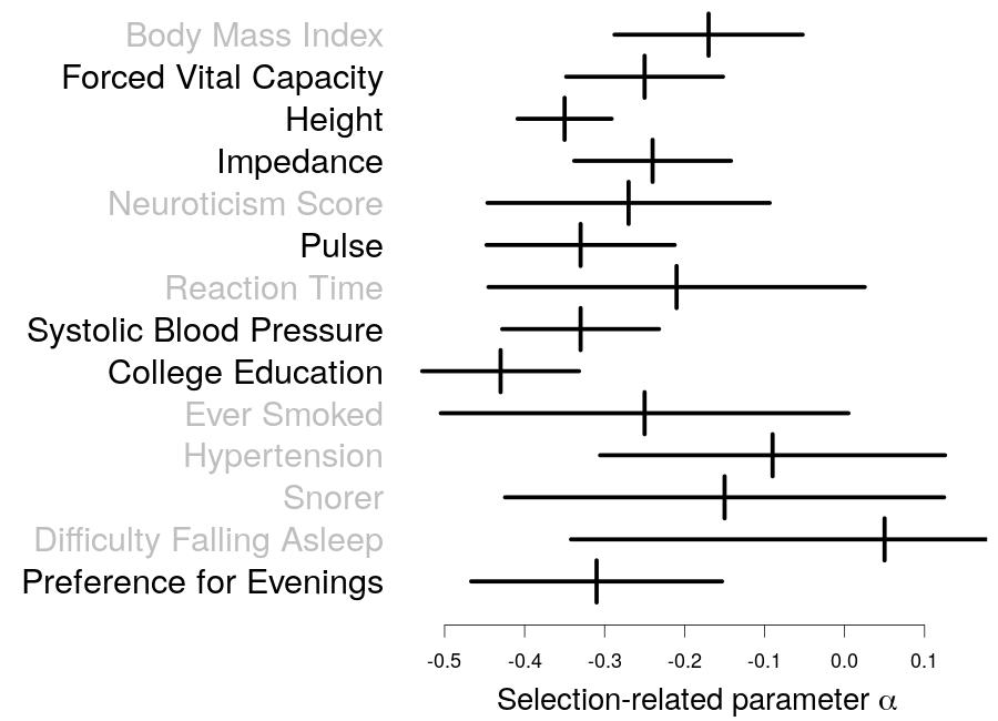 Figure: As humans have evolved, those who possess beneficial traits (e.g., are stronger or more intelligent) have been more likely to reproduce, and therefore their genes are more likely to be passed to future generations. This phenomenon is referred to as natural selection. One way to measure the impact of selection is via the parameter ‘alpha’; lower alpha implies more selection. The above figure reports estimates of alpha for 14 complex traits, obtained using Doug Speed's new tool. We see strongest evidence for selection for height (often considered a proxy for strength) and college education (a proxy for intelligence).
